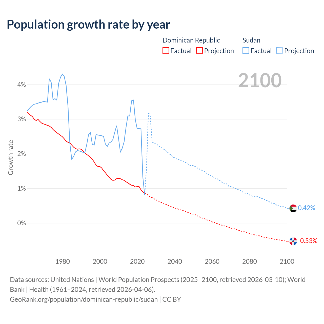 - For the last 10 years, the Dominican Republic has had an average growth rate of +1.04% per year vs +2.67% in Sudan.