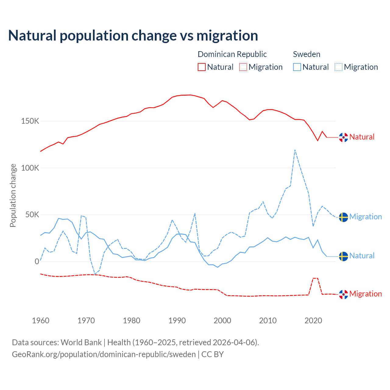 Over the last 10 years, 81.8% of the population change in the Dominican Republic is from natural causes (a gain of 1,447,764 people) and 18.2% is from migration (a loss of 322,919 people). In Sweden 21.4% is from natural causes (a gain of 201,900 people) and 78.6% is from migration (a gain of 743,642 people).