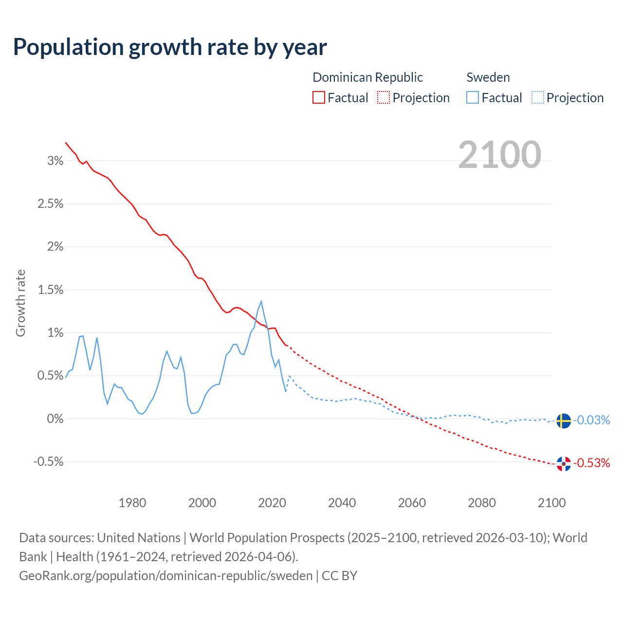 - For the last 10 years, the Dominican Republic has had an average growth rate of +1.04% per year vs +0.88% in Sweden.