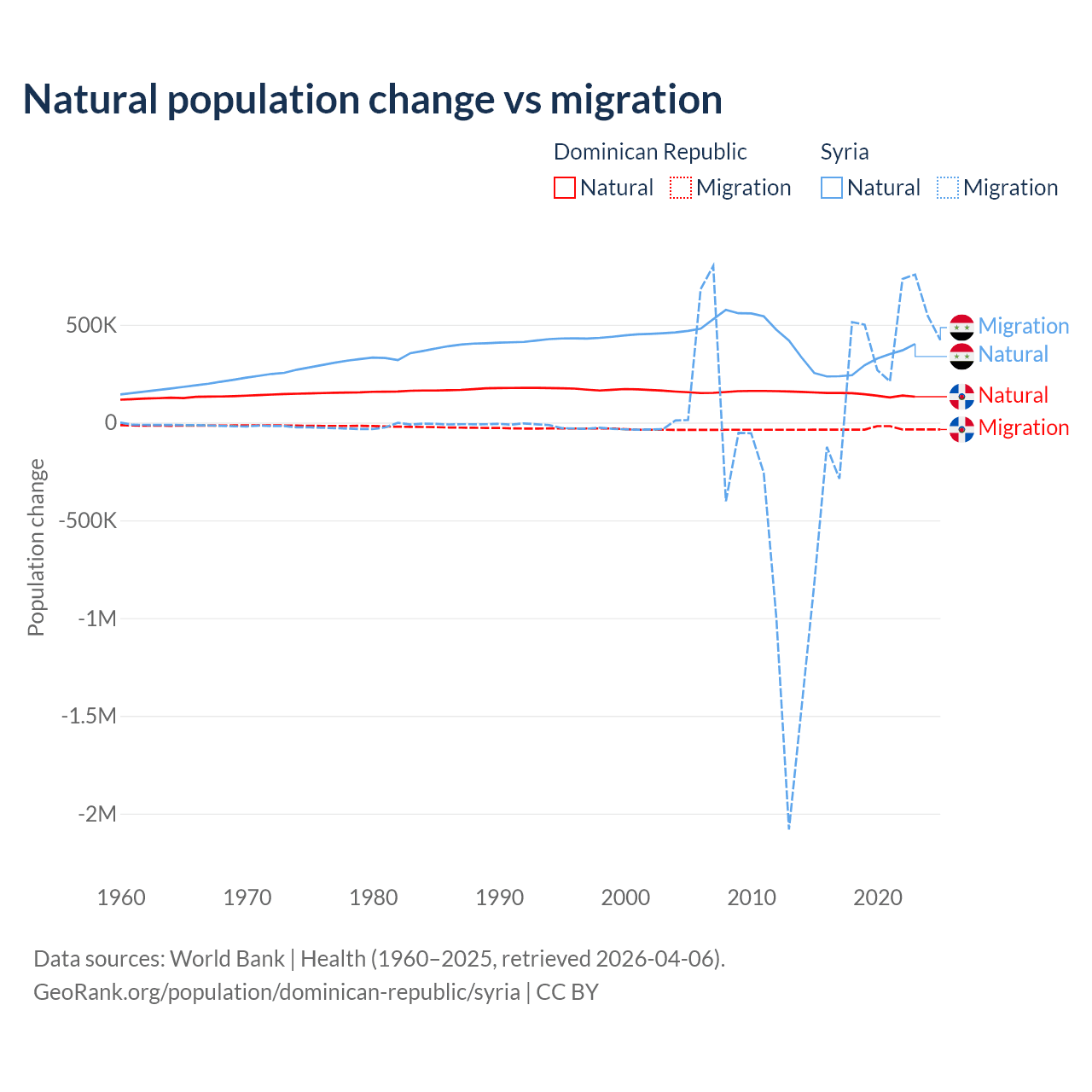 Over the last 10 years, 81.8% of the population change in the Dominican Republic is from natural causes (a gain of 1,447,764 people) and 18.2% is from migration (a loss of 322,919 people). In Syria 91.3% is from natural causes (a gain of 3,047,621 people) and 8.72% is from migration (a gain of 291,069 people).