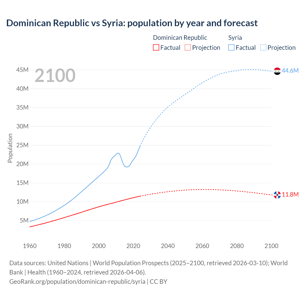 The latest officially reported population of the Dominican Republic was 11,427,557 in 2024 vs 24,672,760 people in Syria in 2024. In 2026, based on the adjusted UN estimation, the current Dominican Republic's population is 11,637,906 people compared to 26,829,400 in Syria.
