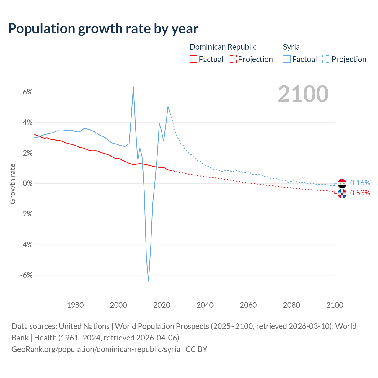 - For the last 10 years, the Dominican Republic has had an average growth rate of +1.04% per year vs +1.25% in Syria.