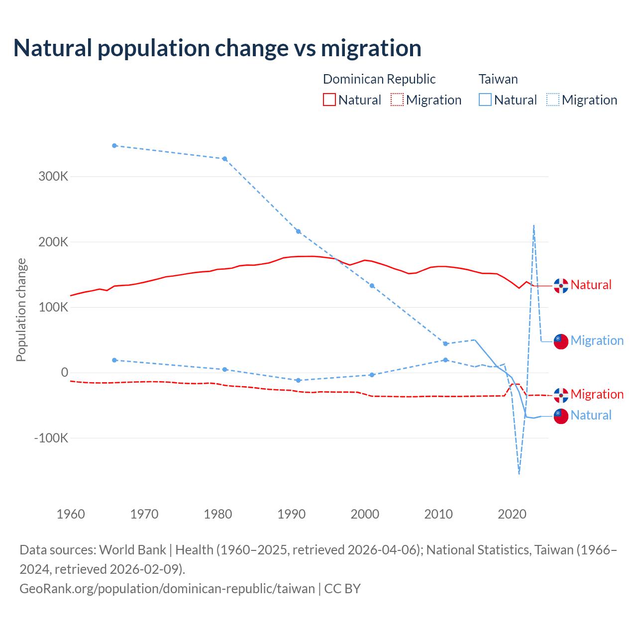 Over the last 10 years, 81.8% of the population change in the Dominican Republic is from natural causes (a gain of 1,447,764 people) and 18.2% is from migration (a loss of 322,919 people). In Taiwan 56.7% is from natural causes (a loss of 57,467 people) and 43.3% is from migration (a gain of 43,884 people).