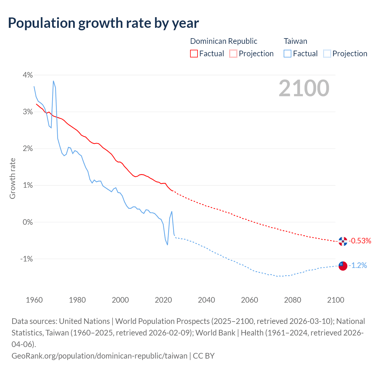 - For the last 10 years, the Dominican Republic has had an average growth rate of +1.04% per year vs -0.03% in Taiwan.