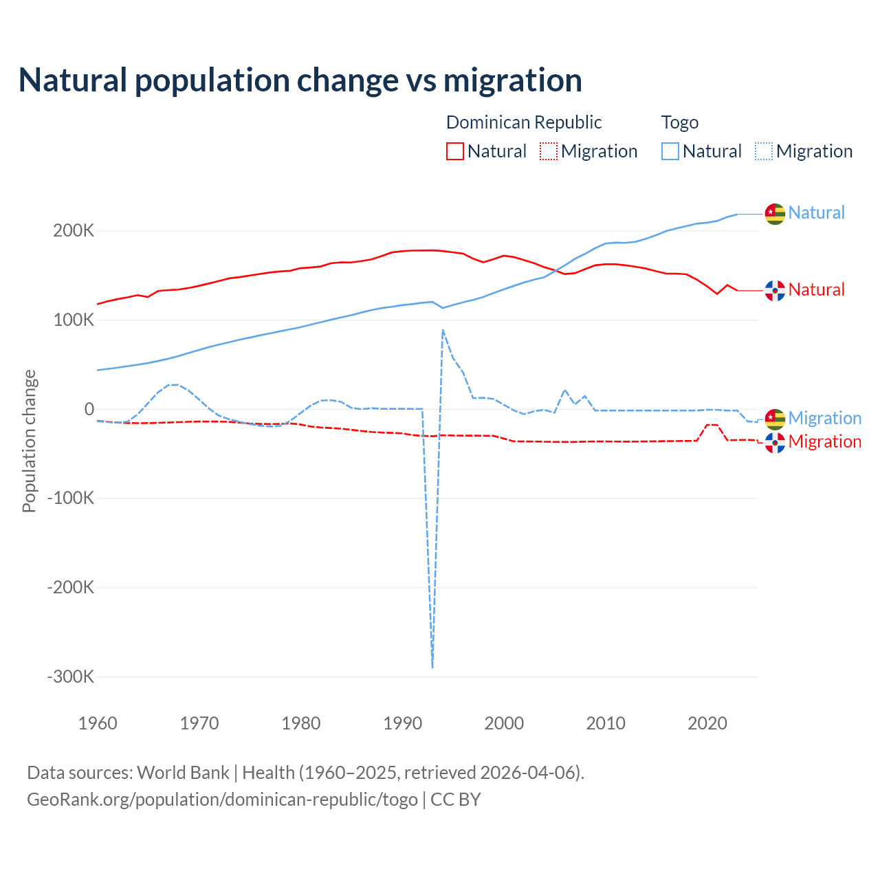 Over the last 10 years, 81.8% of the population change in the Dominican Republic is from natural causes (a gain of 1,447,764 people) and 18.2% is from migration (a loss of 322,919 people). In Togo 99.1% is from natural causes (a gain of 2,052,115 people) and 0.86% is from migration (a loss of 17,852 people).