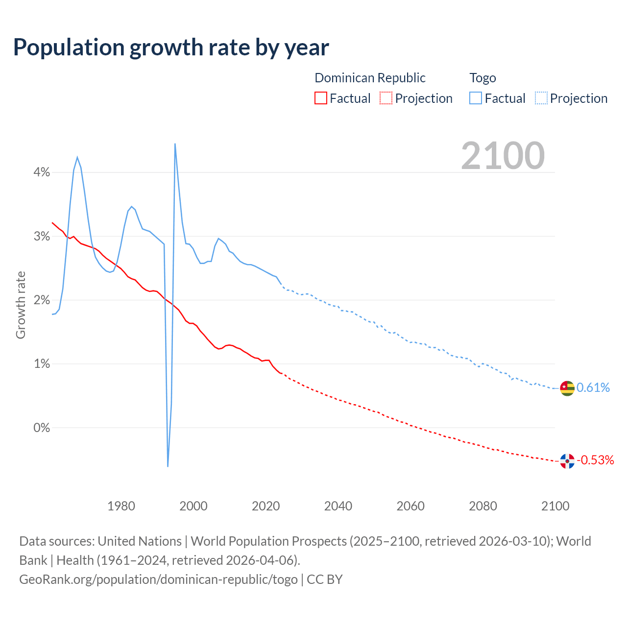 - For the last 10 years, the Dominican Republic has had an average growth rate of +1.04% per year vs +2.46% in Togo.