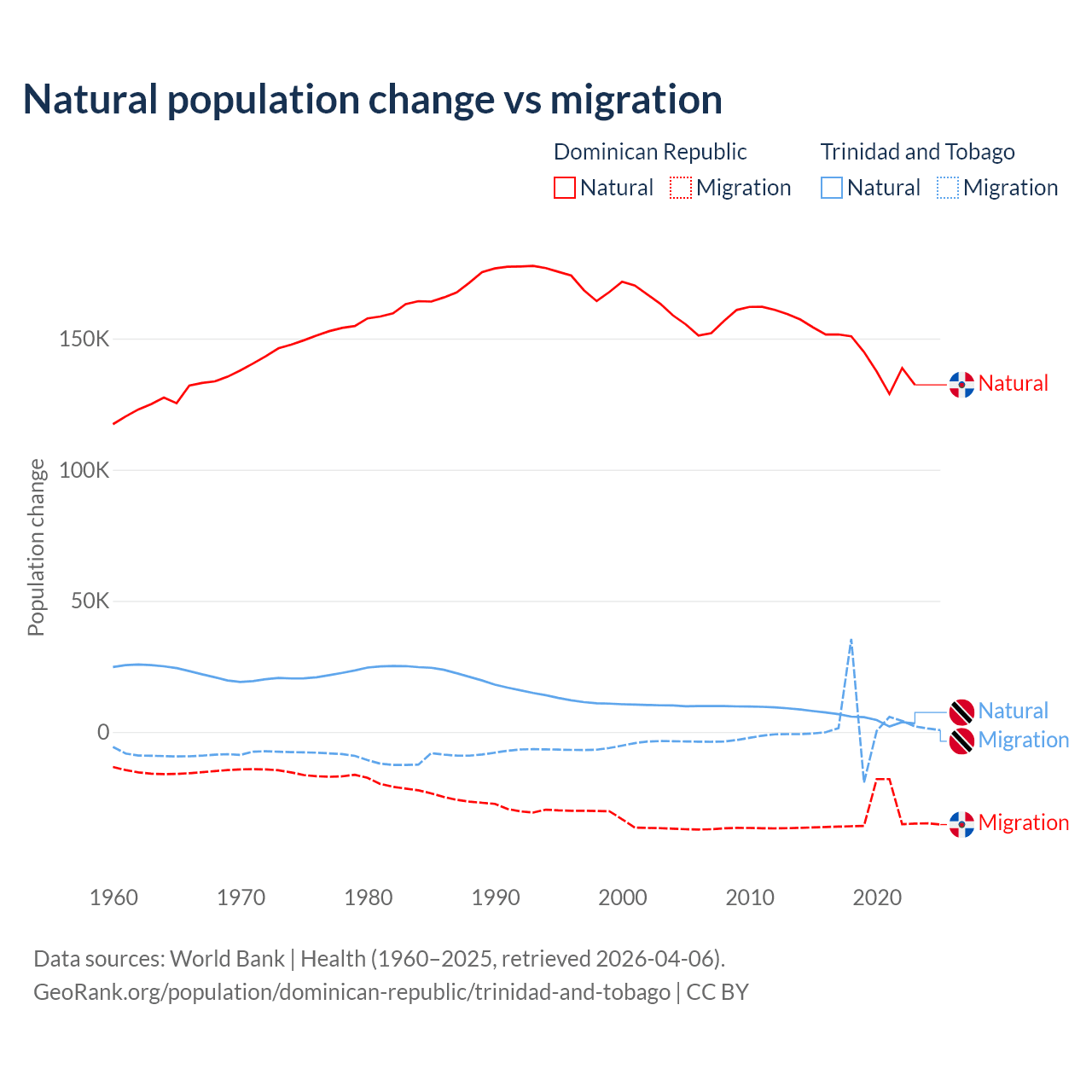 Over the last 10 years, 81.8% of the population change in the Dominican Republic is from natural causes (a gain of 1,447,764 people) and 18.2% is from migration (a loss of 322,919 people). In Trinidad and Tobago 66% is from natural causes (a gain of 55,887 people) and 34% is from migration (a gain of 28,785 people).