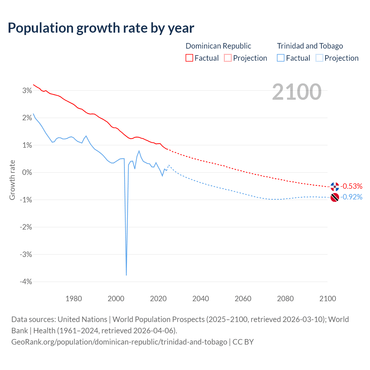 - For the last 10 years, the Dominican Republic has had an average growth rate of +1.04% per year vs +0.19% in Trinidad and Tobago.