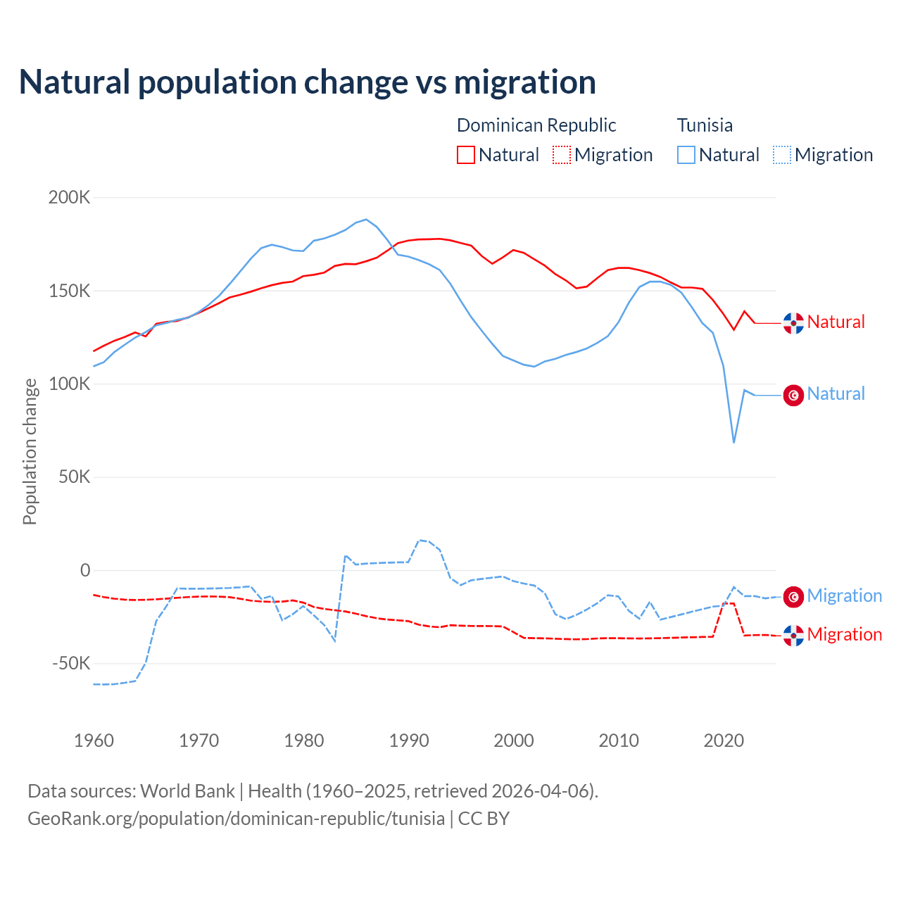 Over the last 10 years, 81.8% of the population change in the Dominican Republic is from natural causes (a gain of 1,447,764 people) and 18.2% is from migration (a loss of 322,919 people). In Tunisia 86.3% is from natural causes (a gain of 1,225,079 people) and 13.7% is from migration (a loss of 195,011 people).