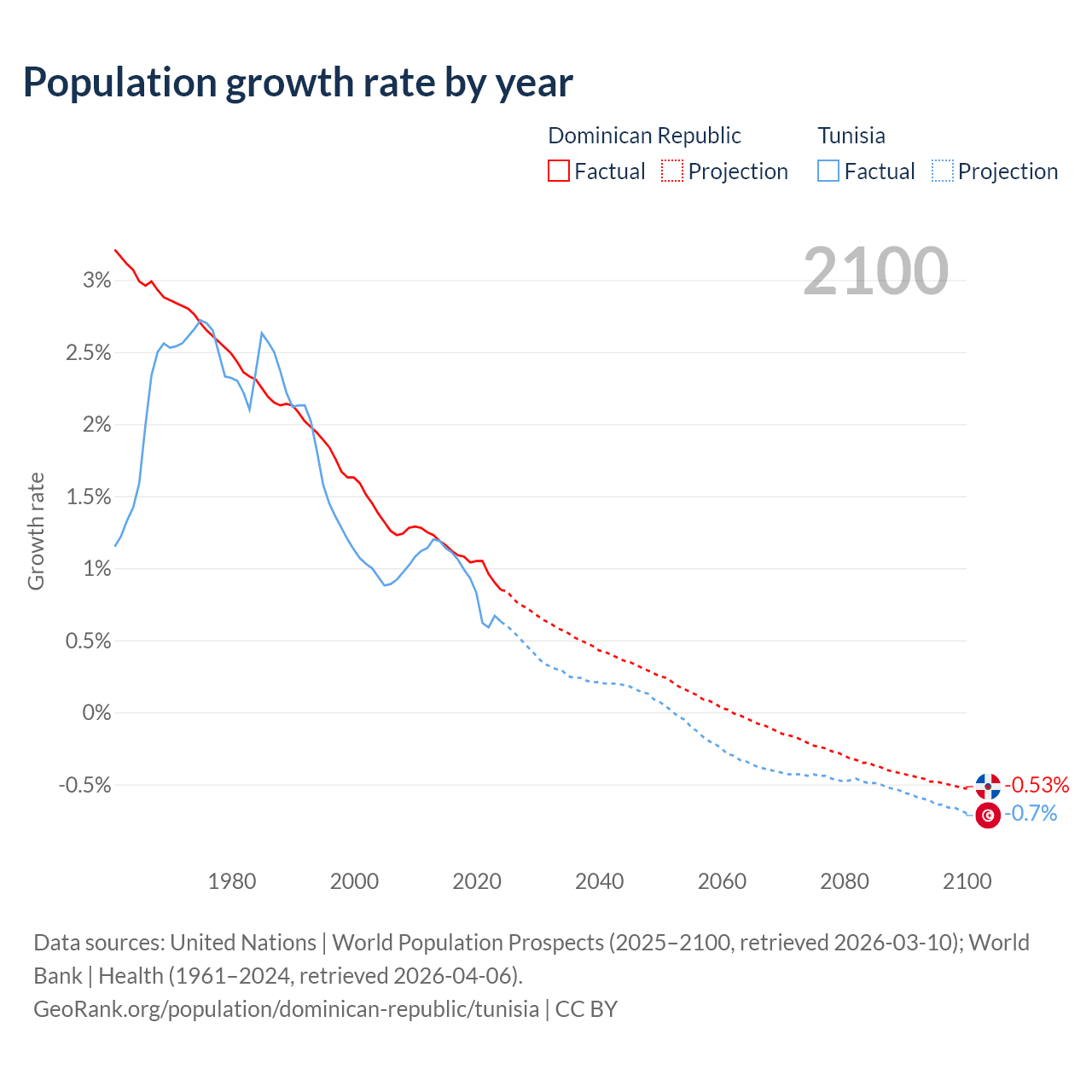 - For the last 10 years, the Dominican Republic has had an average growth rate of +1.04% per year vs +0.89% in Tunisia.