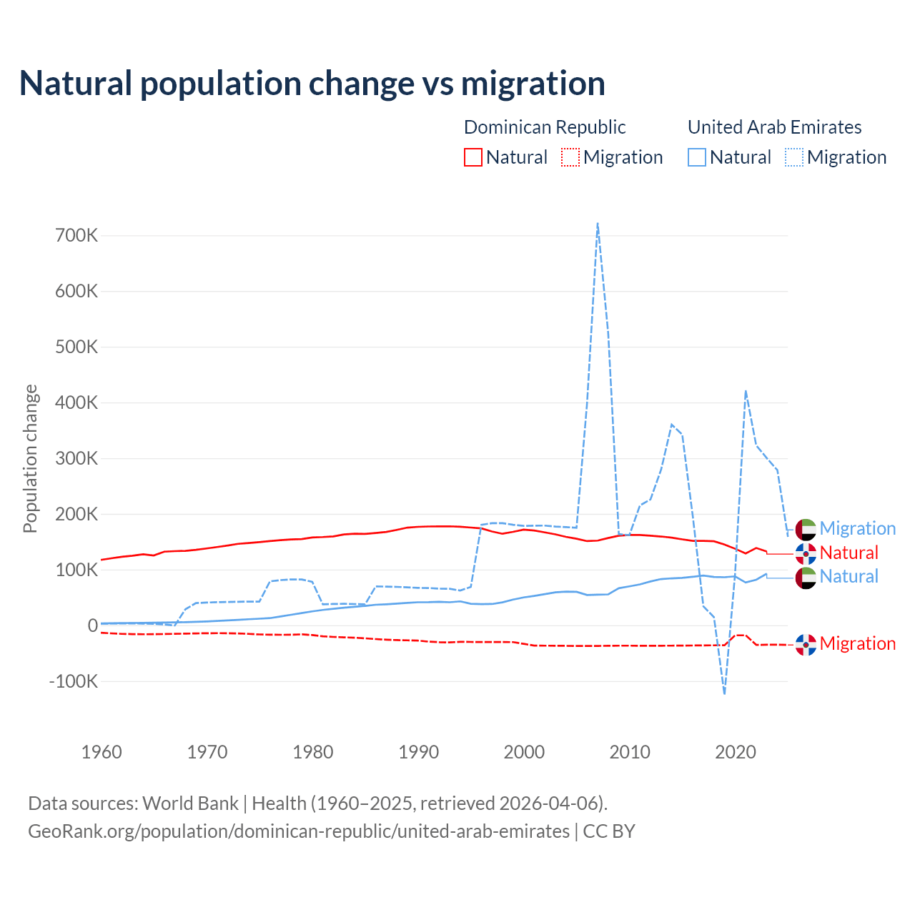 Over the last 10 years, 81.8% of the population change in the Dominican Republic is from natural causes (a gain of 1,447,764 people) and 18.2% is from migration (a loss of 322,919 people). In the United Arab Emirates 30.5% is from natural causes (a gain of 857,996 people) and 69.5% is from migration (a gain of 1,958,520 people).