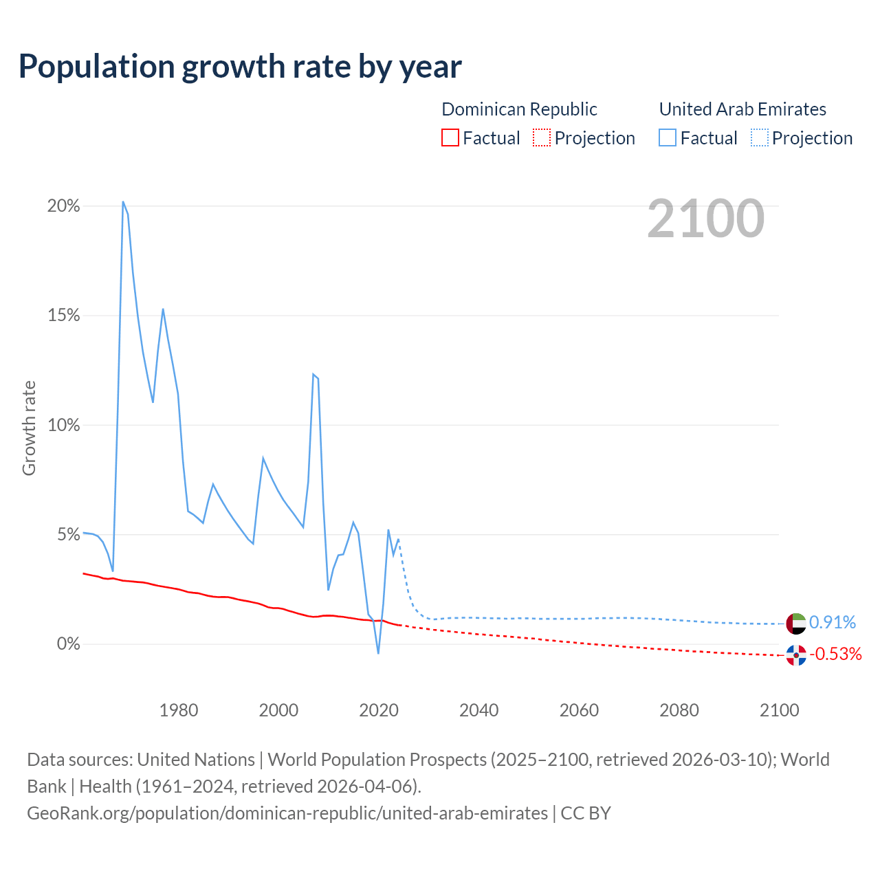 - For the last 10 years, the Dominican Republic has had an average growth rate of +1.04% per year vs +3.31% in the United Arab Emirates.