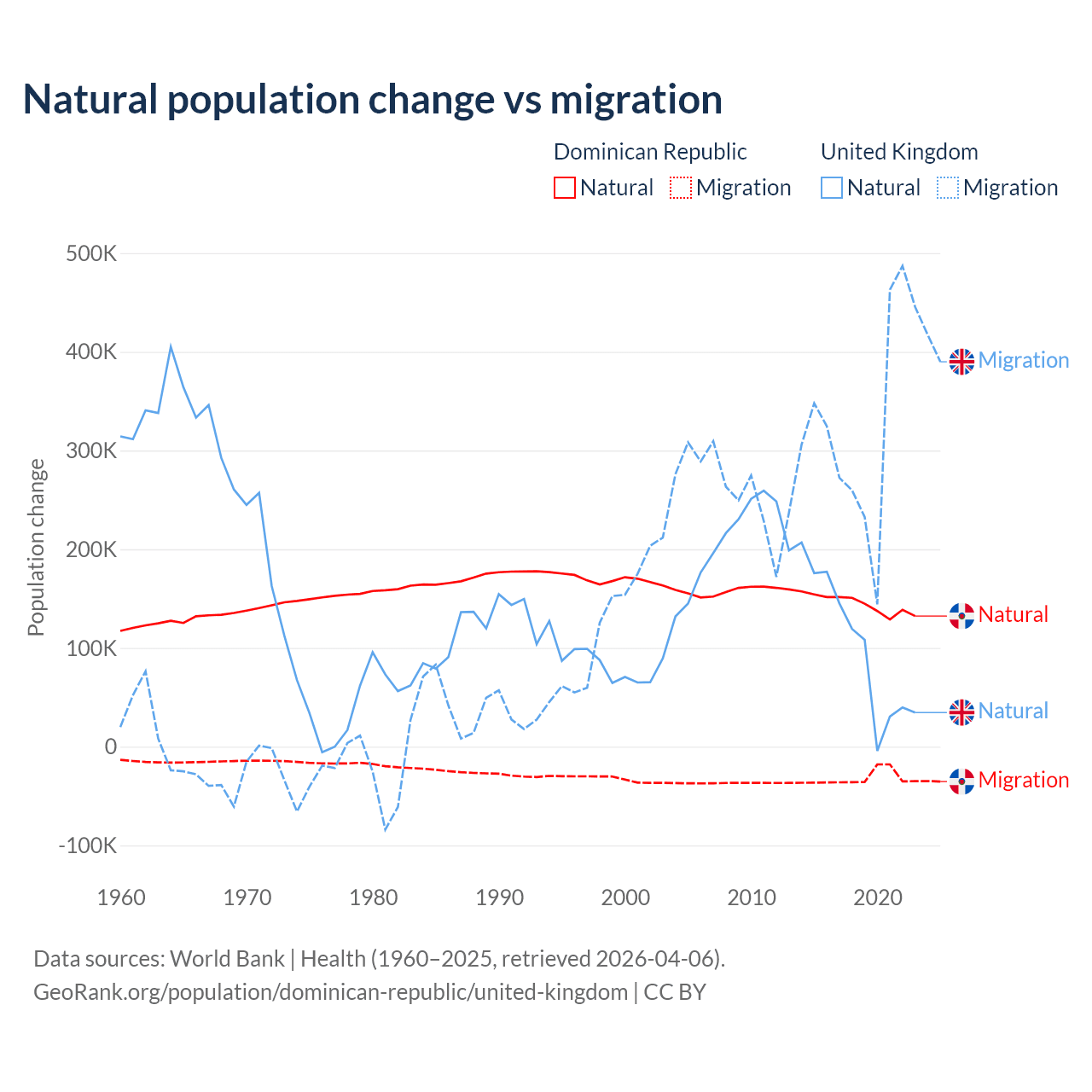 Over the last 10 years, 81.8% of the population change in the Dominican Republic is from natural causes (a gain of 1,447,764 people) and 18.2% is from migration (a loss of 322,919 people). In the United Kingdom 23.9% is from natural causes (a gain of 1,033,129 people) and 76.1% is from migration (a gain of 3,283,101 people).