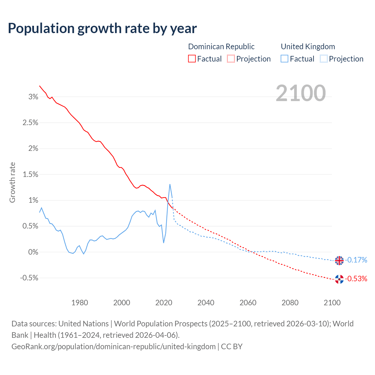 - For the last 10 years, the Dominican Republic has had an average growth rate of +1.04% per year vs +0.7% in the United Kingdom.