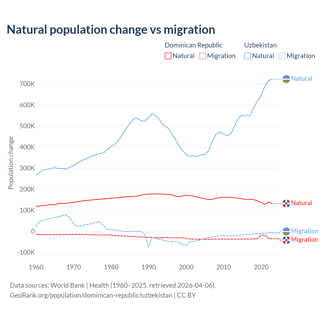 Over the last 10 years, 81.8% of the population change in the Dominican Republic is from natural causes (a gain of 1,447,764 people) and 18.2% is from migration (a loss of 322,919 people). In Uzbekistan 98.2% is from natural causes (a gain of 6,161,117 people) and 1.84% is from migration (a loss of 115,398 people).