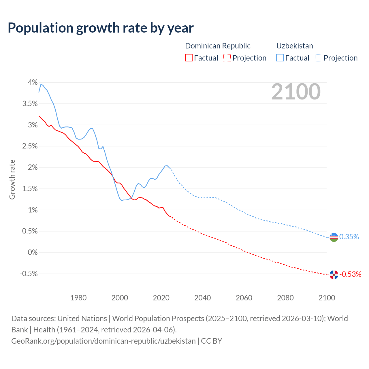 - For the last 10 years, the Dominican Republic has had an average growth rate of +1.04% per year vs +1.85% in Uzbekistan.