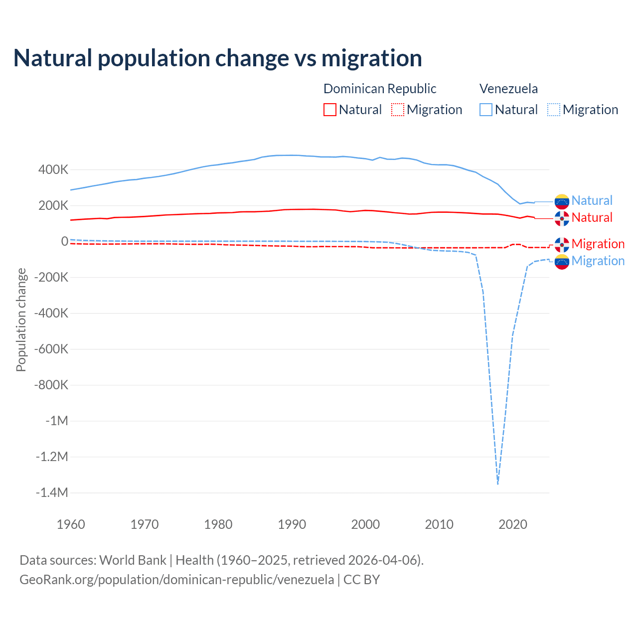 Over the last 10 years, 81.8% of the population change in the Dominican Republic is from natural causes (a gain of 1,447,764 people) and 18.2% is from migration (a loss of 322,919 people). In Venezuela 38.6% is from natural causes (a gain of 2,946,257 people) and 61.4% is from migration (a loss of 4,683,227 people).