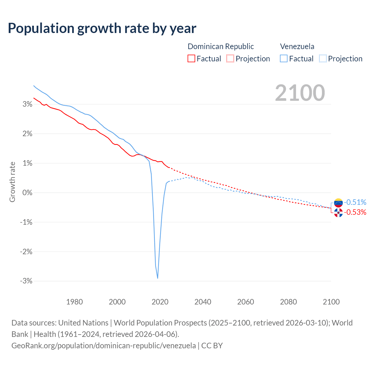 - For the last 10 years, the Dominican Republic has had an average growth rate of +1.04% per year vs -0.46% in Venezuela.