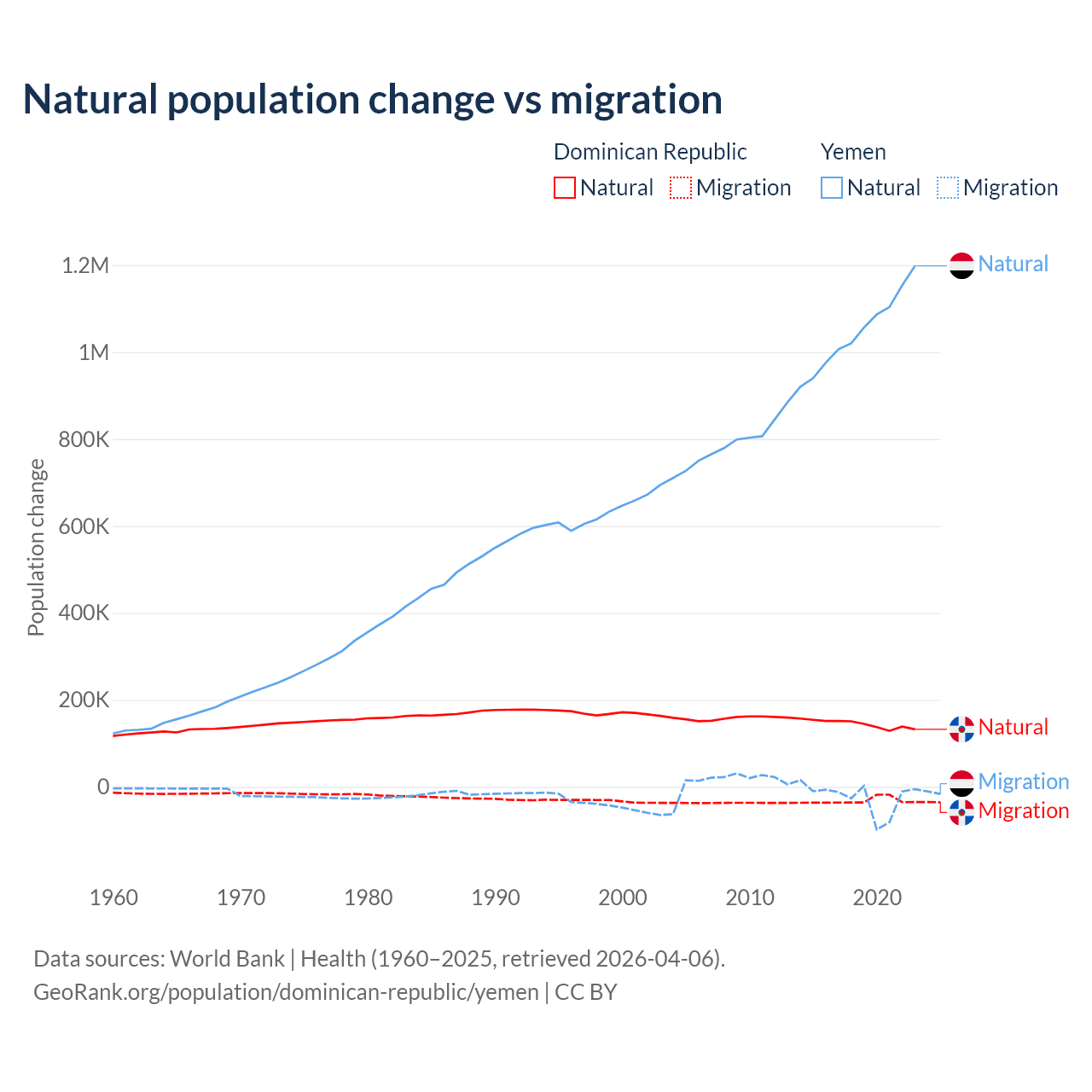 Over the last 10 years, 81.8% of the population change in the Dominican Republic is from natural causes (a gain of 1,447,764 people) and 18.2% is from migration (a loss of 322,919 people). In Yemen 97.8% is from natural causes (a gain of 10,460,813 people) and 2.17% is from migration (a loss of 231,814 people).
