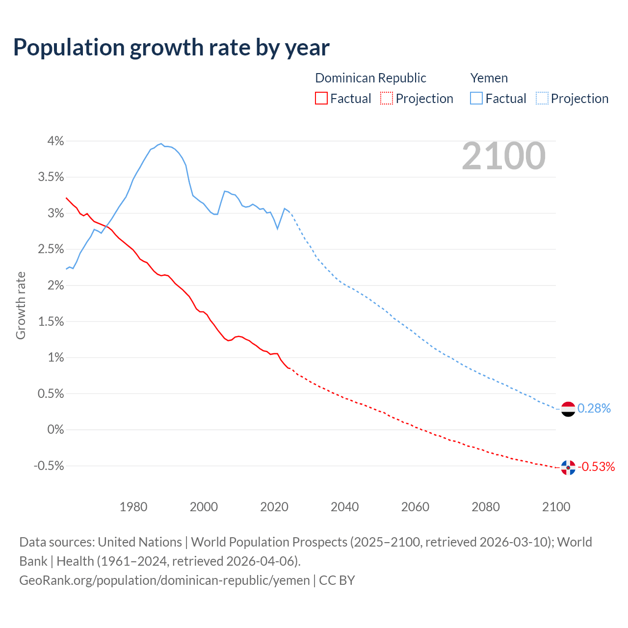 - For the last 10 years, the Dominican Republic has had an average growth rate of +1.04% per year vs +3% in Yemen.