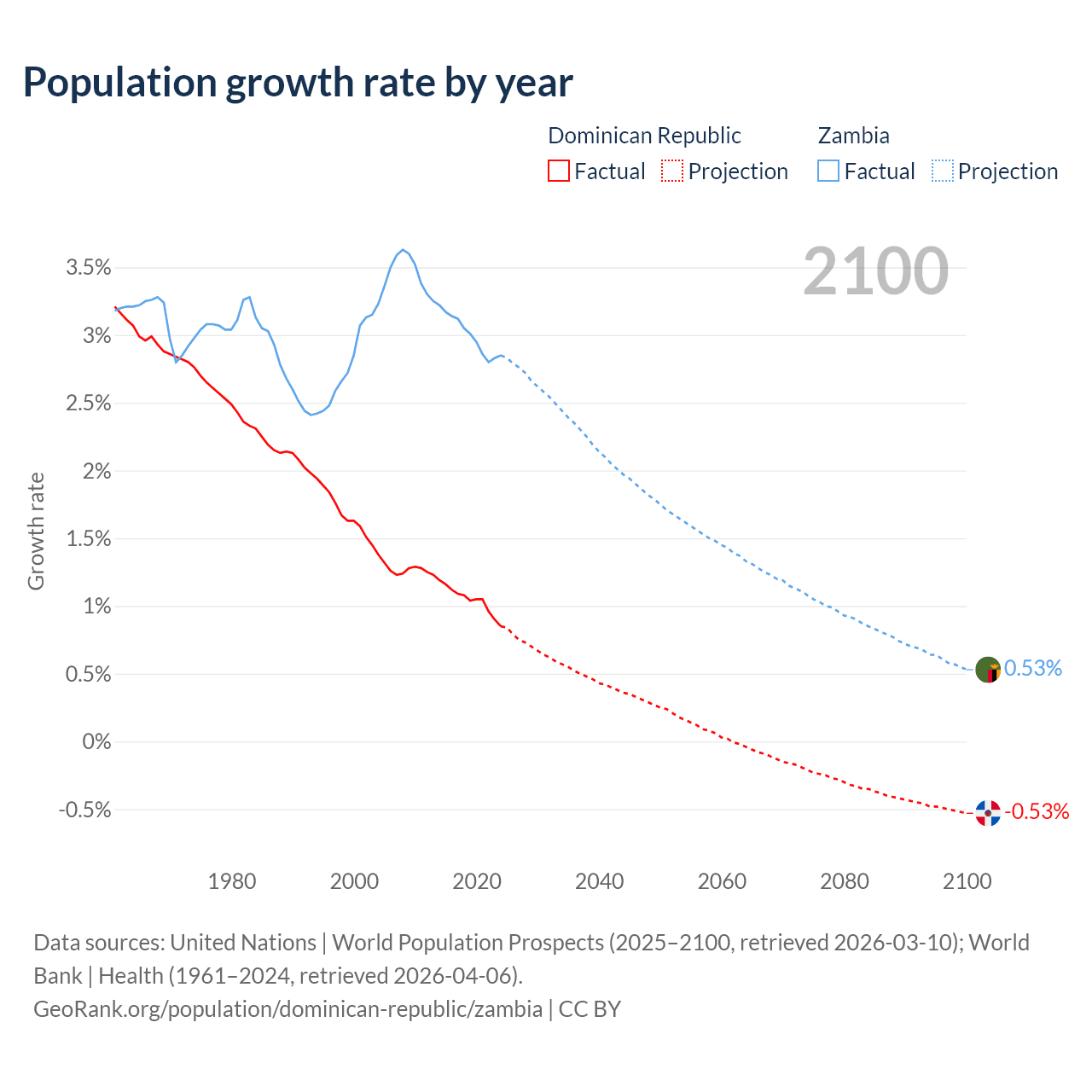 - For the last 10 years, the Dominican Republic has had an average growth rate of +1.04% per year vs +3% in Zambia.