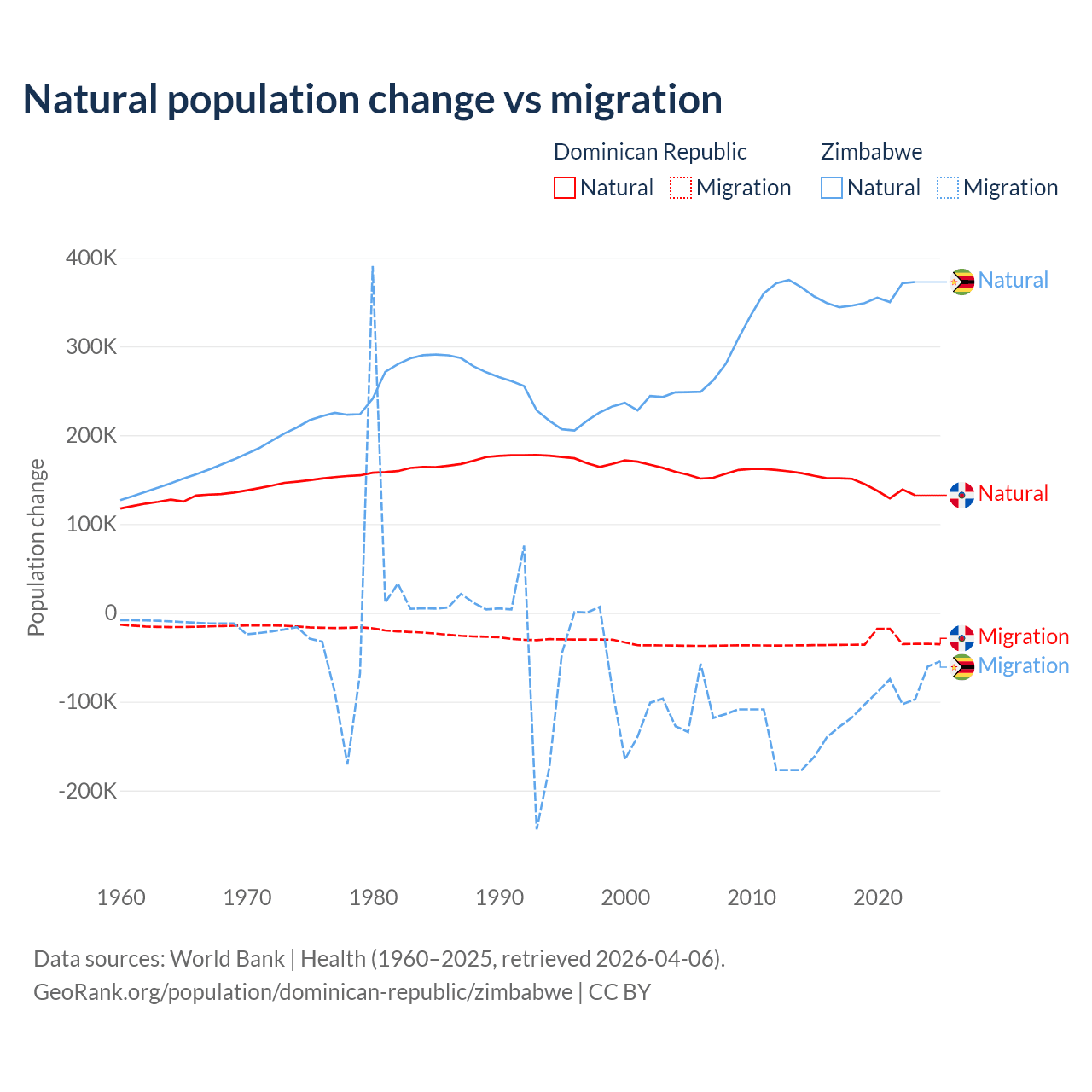 Over the last 10 years, 81.8% of the population change in the Dominican Republic is from natural causes (a gain of 1,447,764 people) and 18.2% is from migration (a loss of 322,919 people). In Zimbabwe 74.9% is from natural causes (a gain of 3,558,487 people) and 25.1% is from migration (a loss of 1,192,807 people).