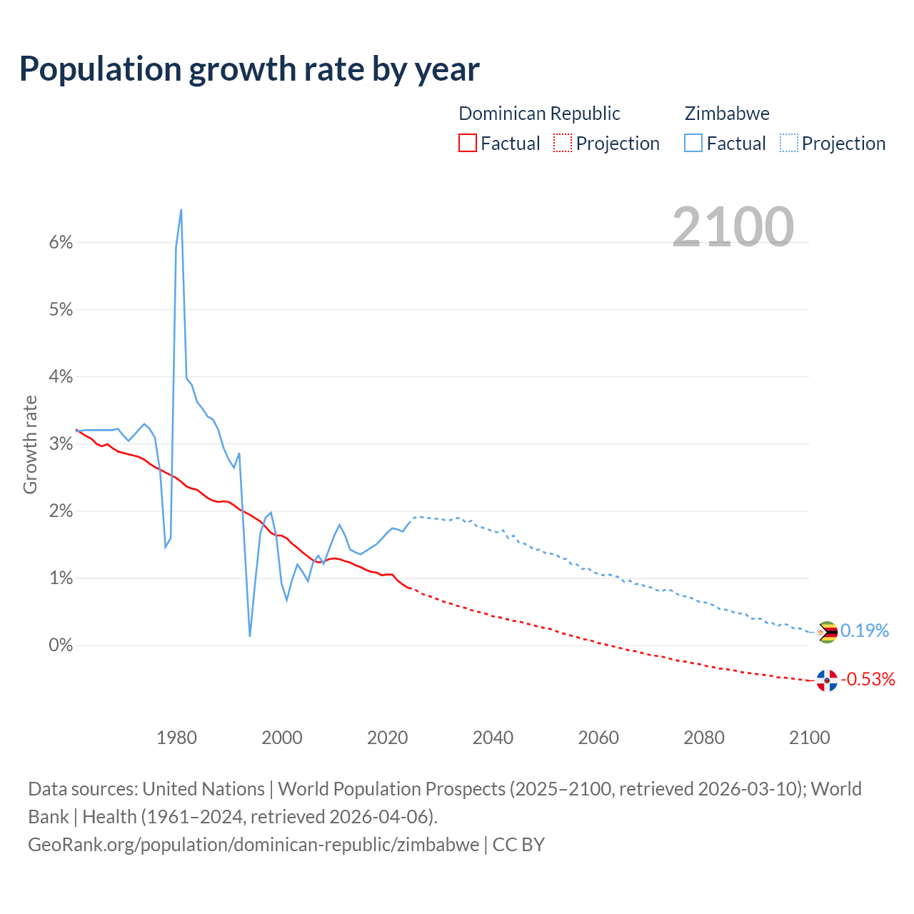 - For the last 10 years, the Dominican Republic has had an average growth rate of +1.04% per year vs +1.57% in Zimbabwe.