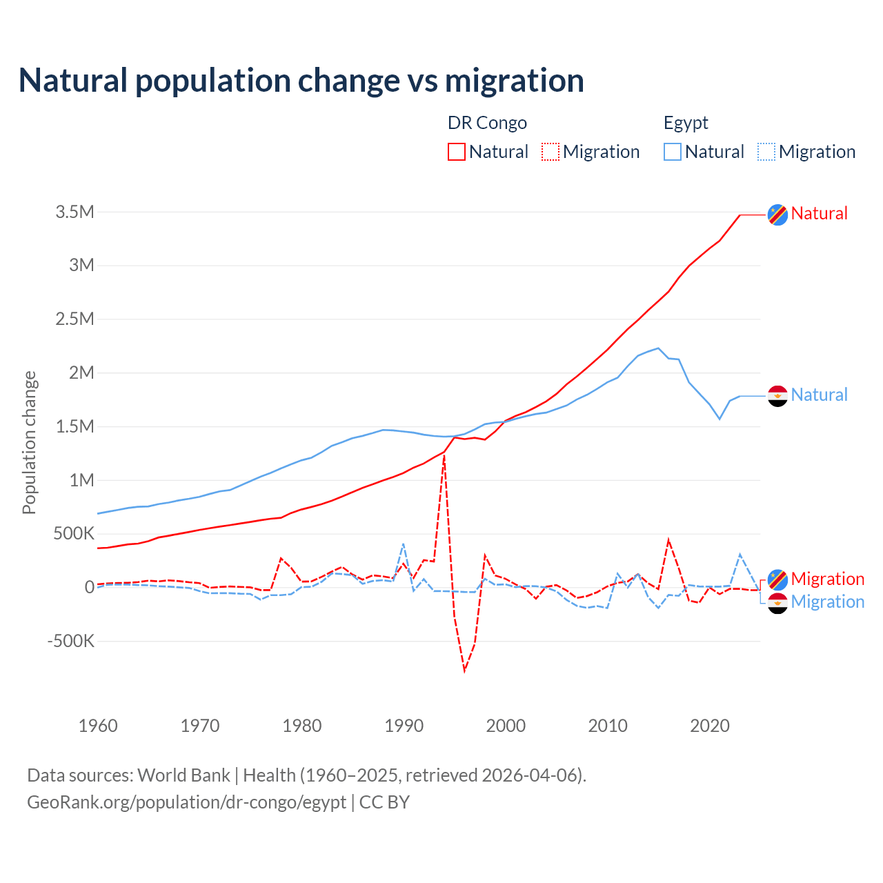Over the last 10 years, 99.1% of the population change in the DR Congo is from natural causes (a gain of 30,150,516 people) and 0.89% is from migration (a gain of 270,872 people). In Egypt 99.6% is from natural causes (a gain of 19,180,073 people) and 0.41% is from migration (a loss of 78,975 people).
