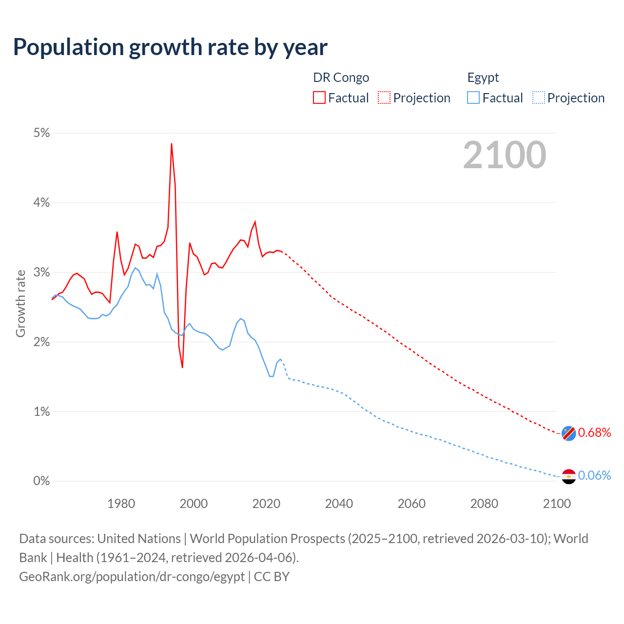 - For the last 10 years, the DR Congo has had an average growth rate of +3.38% per year vs +1.84% in Egypt.