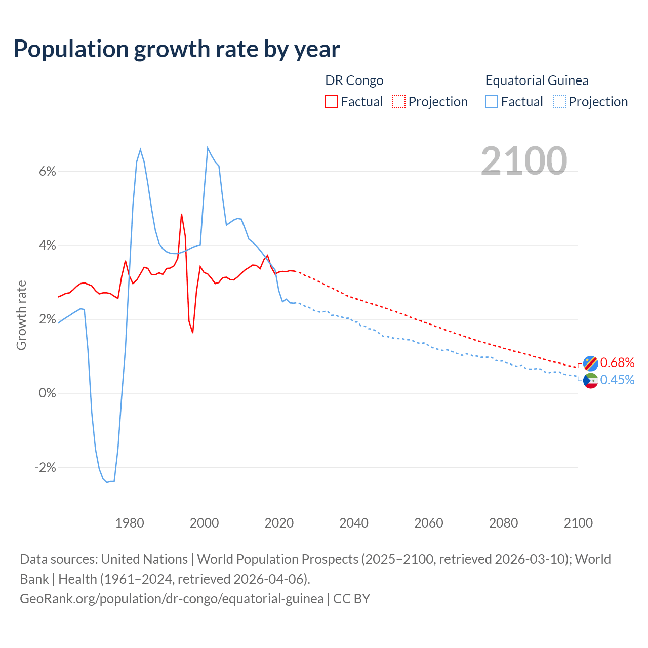 - For the last 10 years, the DR Congo has had an average growth rate of +3.38% per year vs +3.15% in Equatorial Guinea.