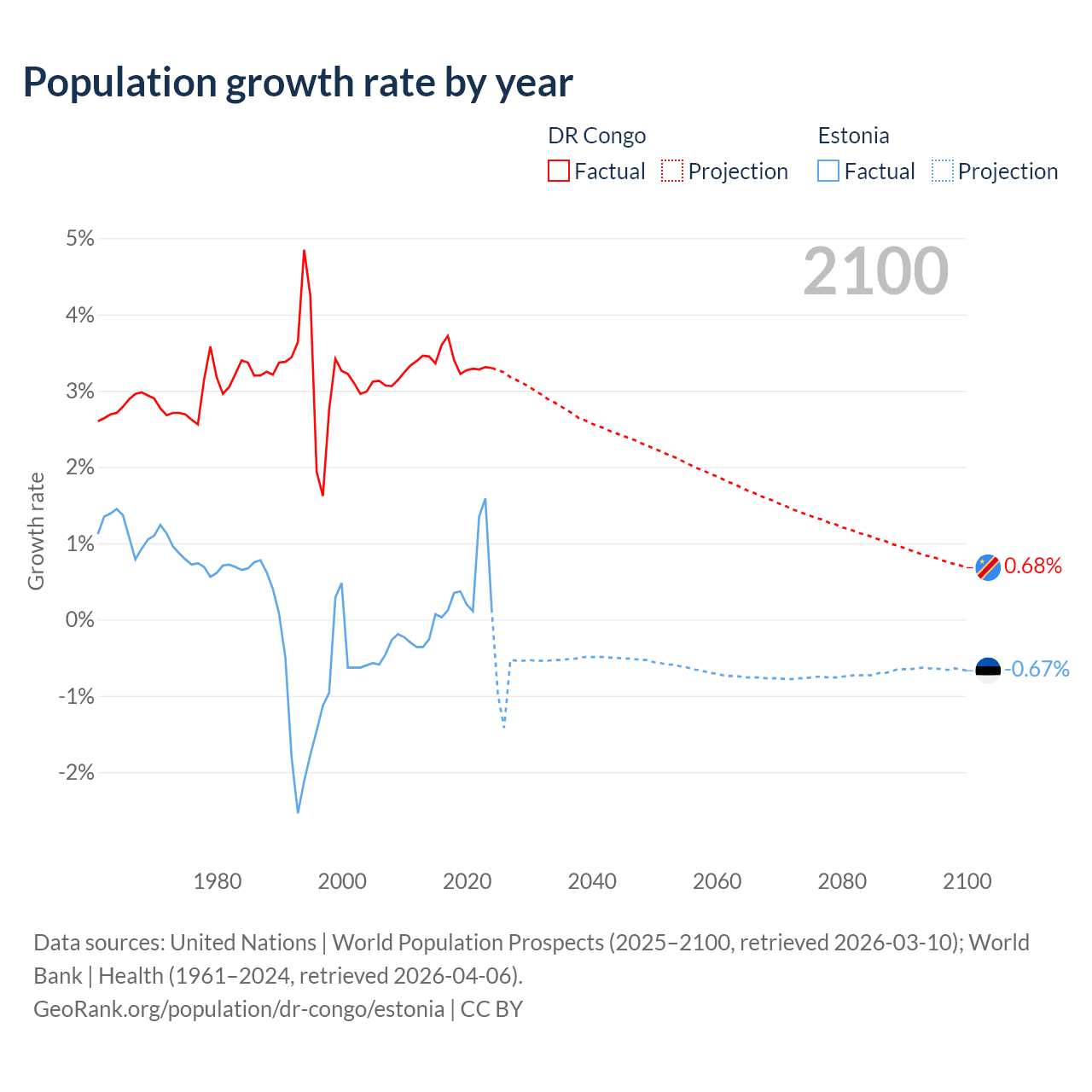 DR Congo vs Estonia: population by year and forecast