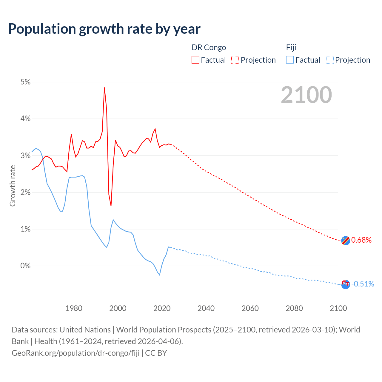 - For the last 10 years, the DR Congo has had an average growth rate of +3.38% per year vs +0.12% in Fiji.