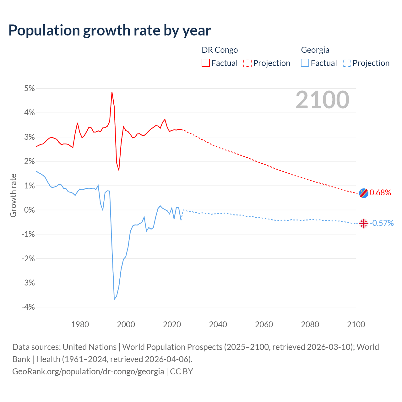 - For the last 10 years, the DR Congo has had an average growth rate of +3.38% per year vs -0.04% in Georgia.