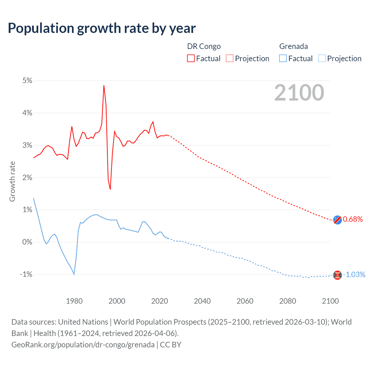 - For the last 10 years, the DR Congo has had an average growth rate of +3.38% per year vs +0.29% in Grenada.