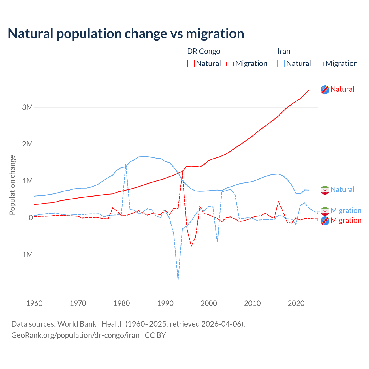 Over the last 10 years, 99.1% of the population change in the DR Congo is from natural causes (a gain of 30,150,516 people) and 0.89% is from migration (a gain of 270,872 people). In Iran 92.5% is from natural causes (a gain of 9,405,860 people) and 7.46% is from migration (a gain of 757,979 people).