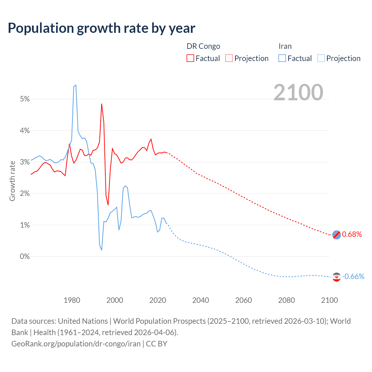 - For the last 10 years, the DR Congo has had an average growth rate of +3.38% per year vs +1.19% in Iran.