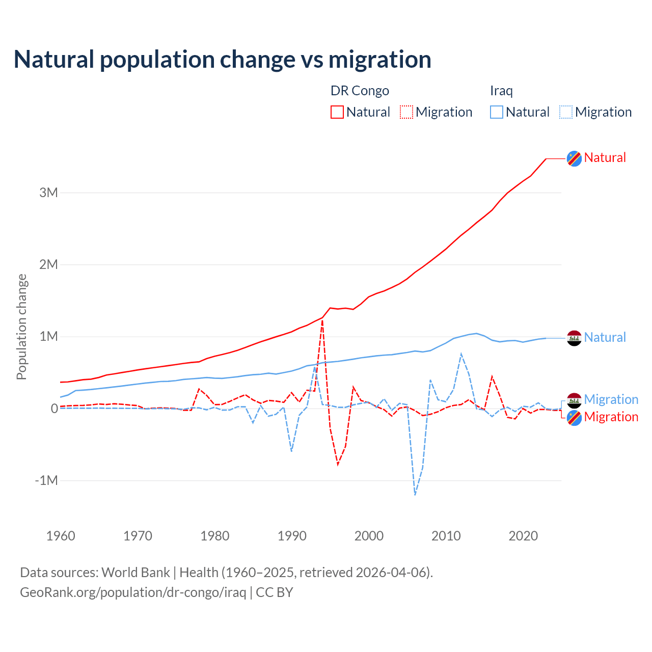 Over the last 10 years, 99.1% of the population change in the DR Congo is from natural causes (a gain of 30,150,516 people) and 0.89% is from migration (a gain of 270,872 people). In Iraq 99.2% is from natural causes (a gain of 9,598,842 people) and 0.76% is from migration (a loss of 73,050 people).