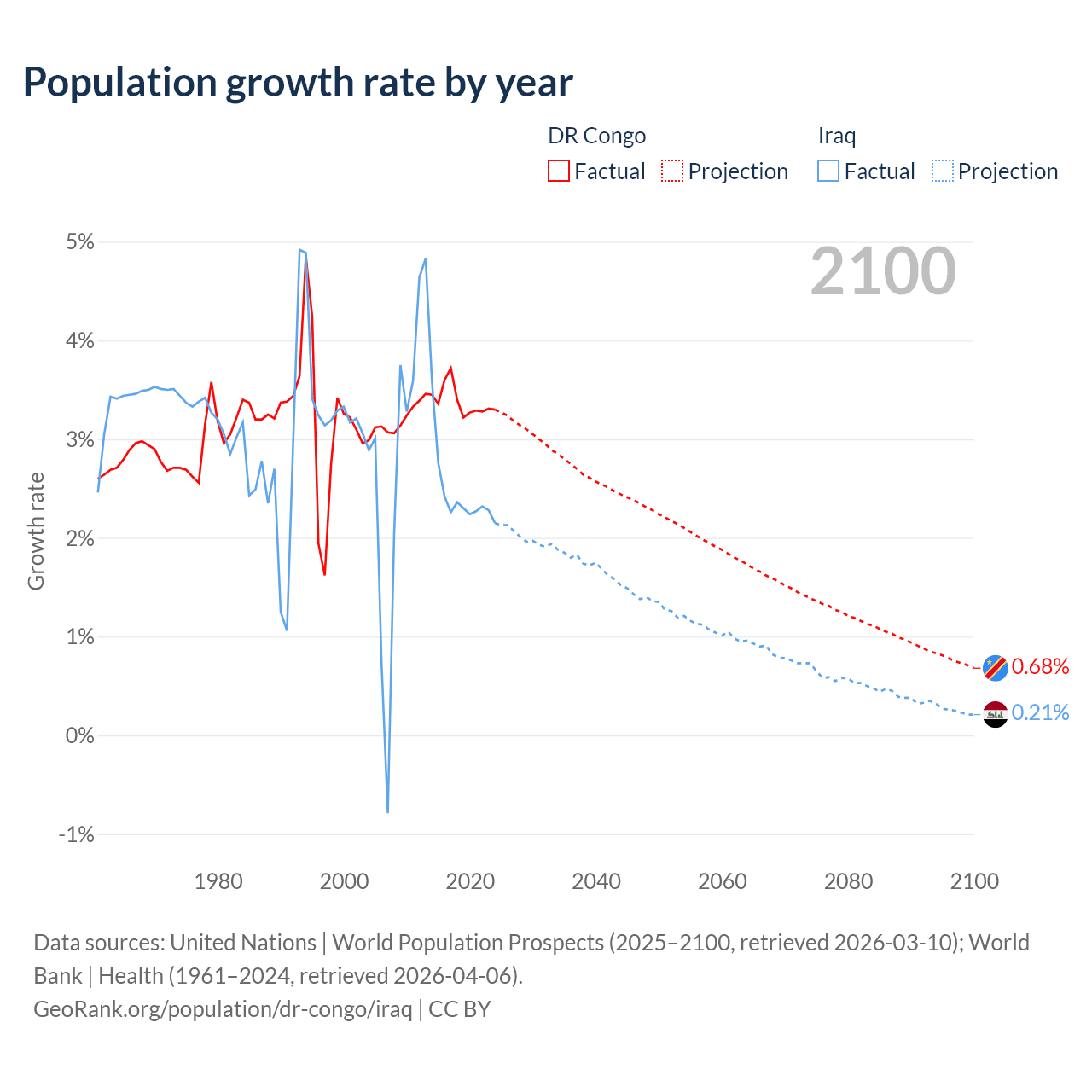 - For the last 10 years, the DR Congo has had an average growth rate of +3.38% per year vs +2.45% in Iraq.