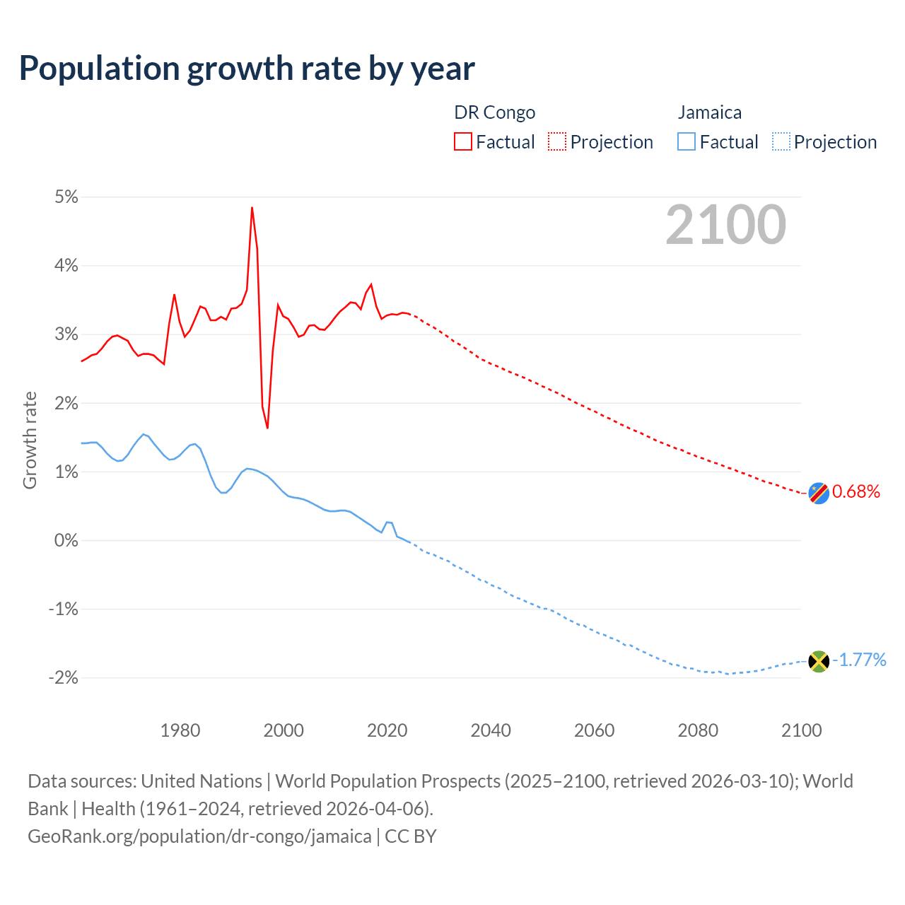 - For the last 10 years, the DR Congo has had an average growth rate of +3.38% per year vs +0.18% in Jamaica.