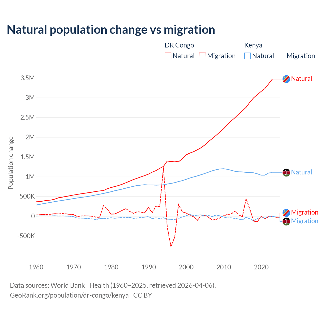 Over the last 10 years, 99.1% of the population change in the DR Congo is from natural causes (a gain of 30,150,516 people) and 0.89% is from migration (a gain of 270,872 people). In Kenya 95.3% is from natural causes (a gain of 10,892,362 people) and 4.67% is from migration (a loss of 533,876 people).
