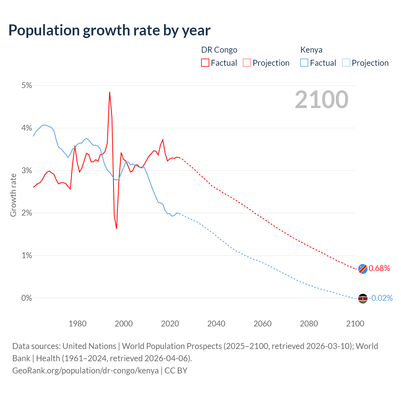 - For the last 10 years, the DR Congo has had an average growth rate of +3.38% per year vs +2.08% in Kenya.