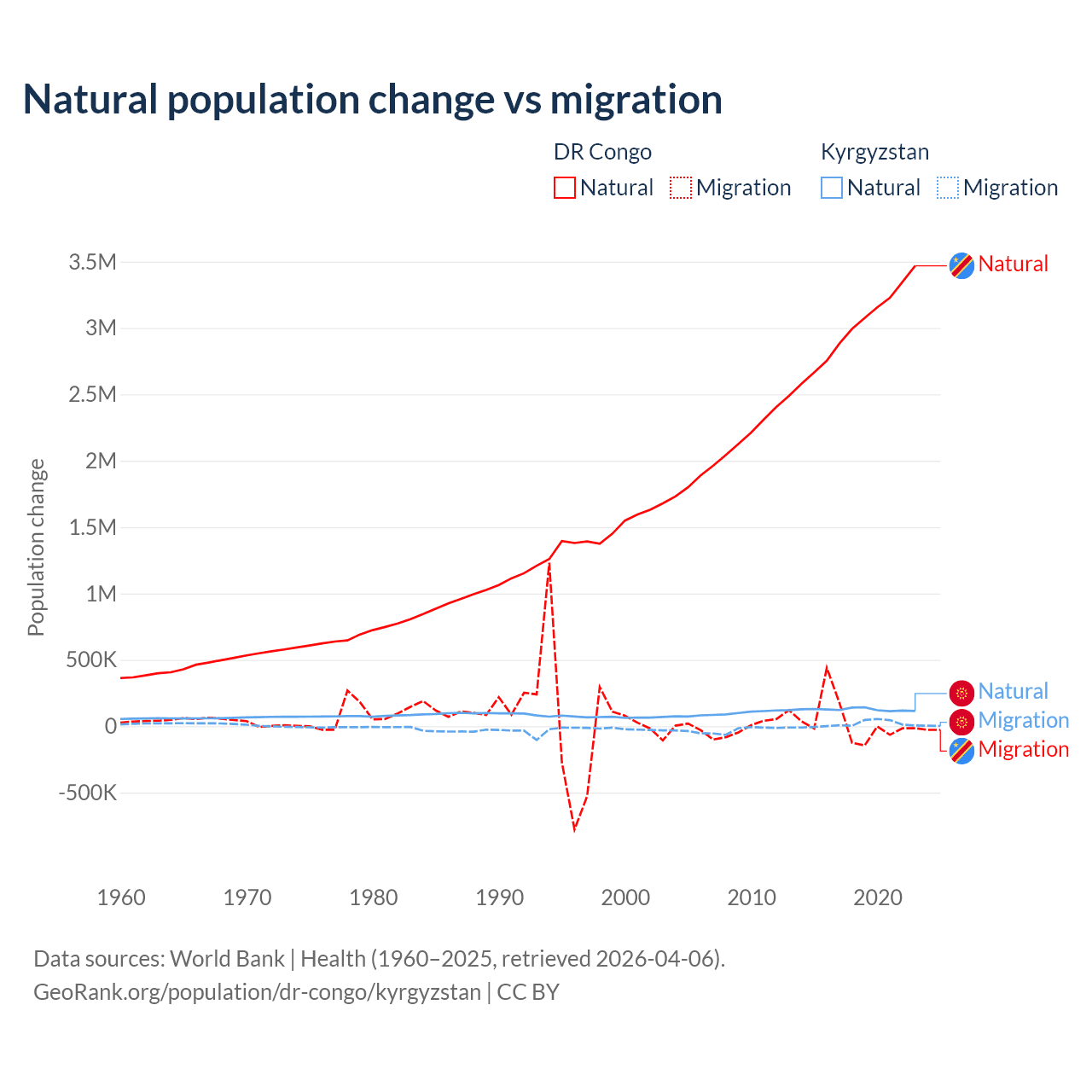 Over the last 10 years, 99.1% of the population change in the DR Congo is from natural causes (a gain of 30,150,516 people) and 0.89% is from migration (a gain of 270,872 people). In Kyrgyzstan 88.5% is from natural causes (a gain of 1,258,837 people) and 11.5% is from migration (a gain of 164,132 people).