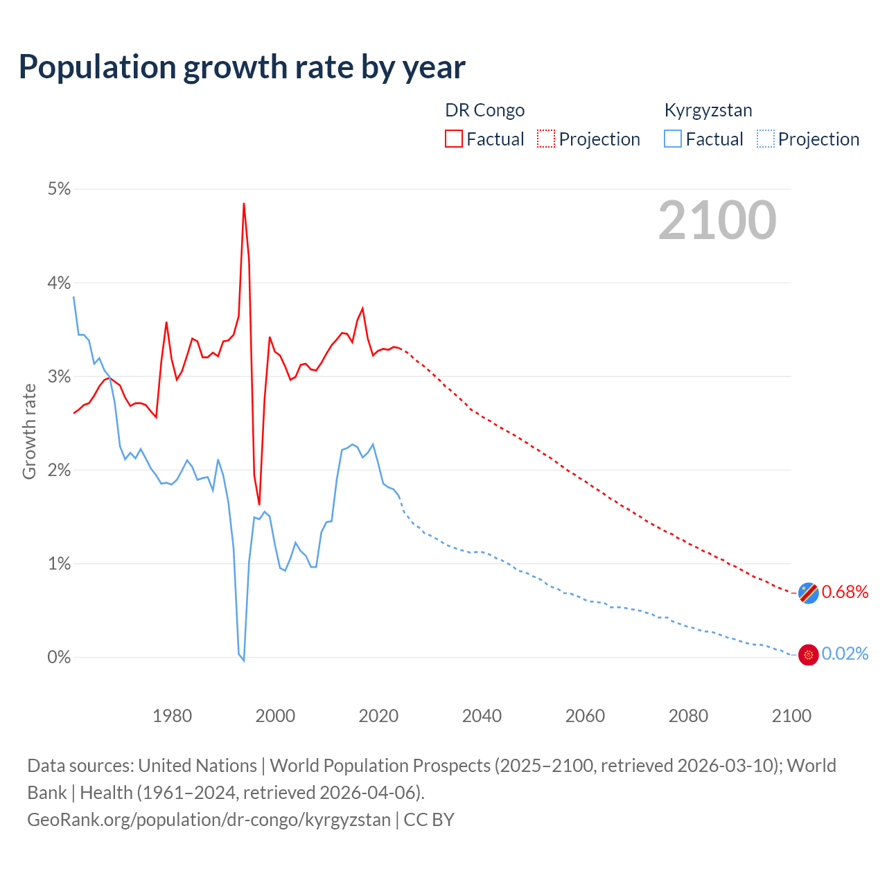 - For the last 10 years, the DR Congo has had an average growth rate of +3.38% per year vs +2.05% in Kyrgyzstan.