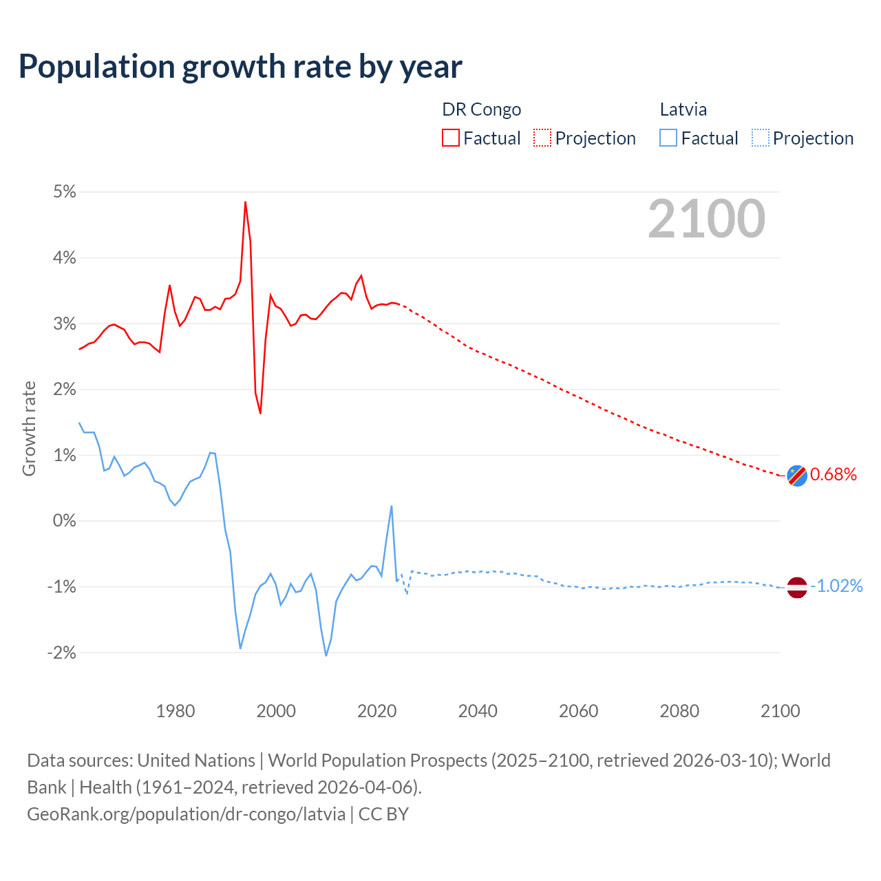 - For the last 10 years, the DR Congo has had an average growth rate of +3.38% per year vs -0.68% in Latvia.