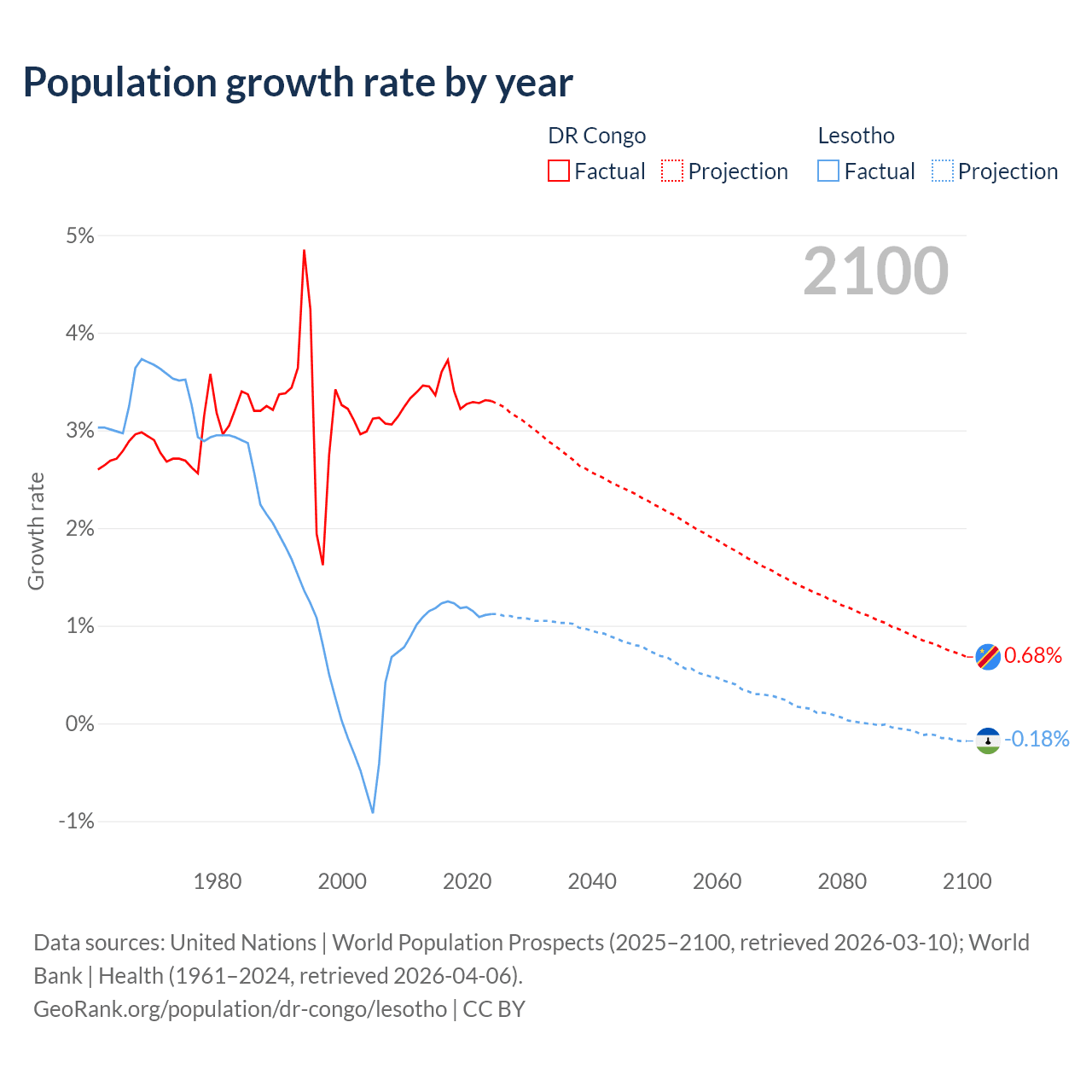 - For the last 10 years, the DR Congo has had an average growth rate of +3.38% per year vs +1.17% in Lesotho.