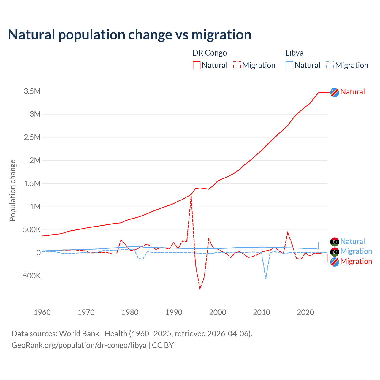 Over the last 10 years, 99.1% of the population change in the DR Congo is from natural causes (a gain of 30,150,516 people) and 0.89% is from migration (a gain of 270,872 people). In Libya 99.4% is from natural causes (a gain of 975,799 people) and 0.63% is from migration (a loss of 6,150 people).