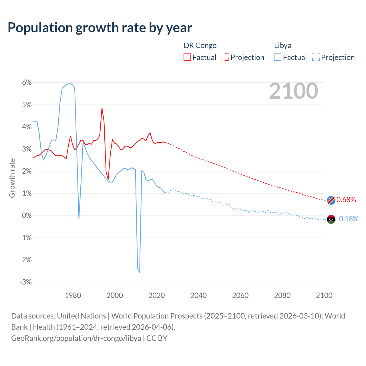 - For the last 10 years, the DR Congo has had an average growth rate of +3.38% per year vs +1.44% in Libya.