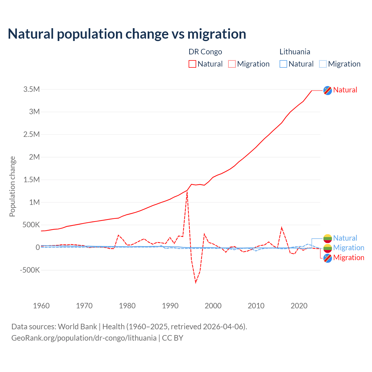 Over the last 10 years, 99.1% of the population change in the DR Congo is from natural causes (a gain of 30,150,516 people) and 0.89% is from migration (a gain of 270,872 people). In Lithuania 68.7% is from natural causes (a loss of 153,859 people) and 31.3% is from migration (a gain of 70,196 people).