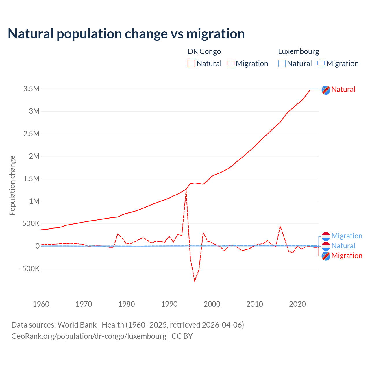 Over the last 10 years, 99.1% of the population change in the DR Congo is from natural causes (a gain of 30,150,516 people) and 0.89% is from migration (a gain of 270,872 people). In Luxembourg 16.8% is from natural causes (a gain of 20,287 people) and 83.2% is from migration (a gain of 100,435 people).