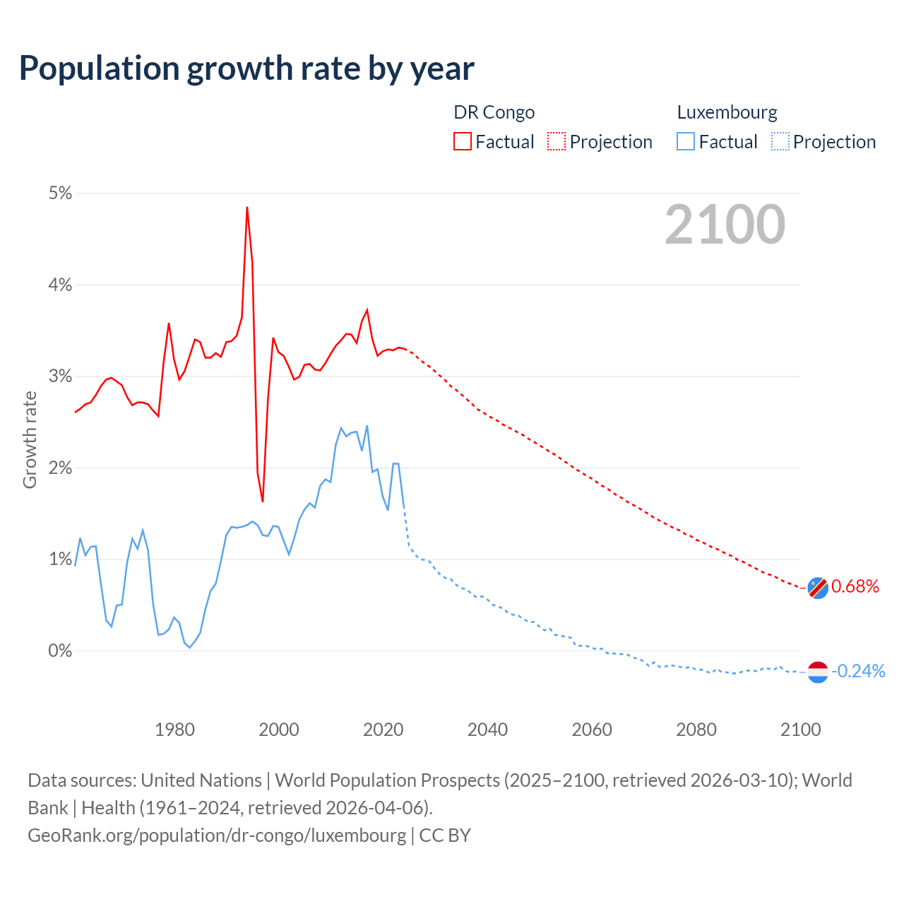 - For the last 10 years, the DR Congo has had an average growth rate of +3.38% per year vs +2.02% in Luxembourg.